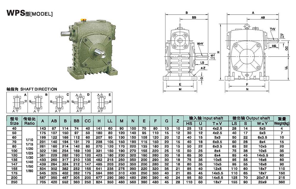 WPS系列蝸輪蝸桿減速機(jī)的外形尺寸及安裝尺寸,WPS減速機(jī)軸輸入,軸輸出.WPS減速機(jī)軸指向表示方法.機(jī)座號(hào)從40到250,可選速比從10到60.WPS系列蝸輪蝸桿減速機(jī)選型指南,選型方法
