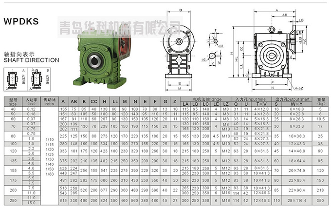 WPDKS蝸輪蝸桿減速機的外形尺寸及安裝尺寸,WPDKS減速機法蘭輸入,軸輸出.WPDKS減速機軸指向表示方法.機座號從40到250,可選速比從10到60.WPDKS系列蝸輪蝸桿減速機選型指南