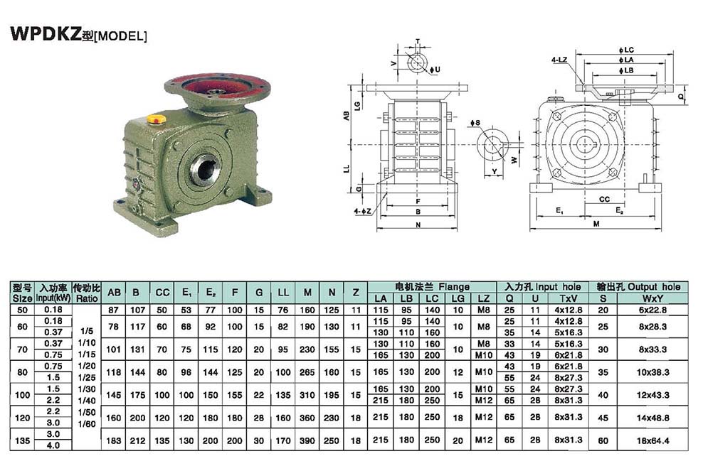 WPDKZ減速機軸指向表示方法.WPDKZ減速機法蘭輸入,軸輸出.機座號從50到135,可選速比從10到60.WPDKZ系列蝸輪蝸桿減速機選型指南,WPDKZ蝸輪蝸桿減速機的外形尺寸及安裝尺寸