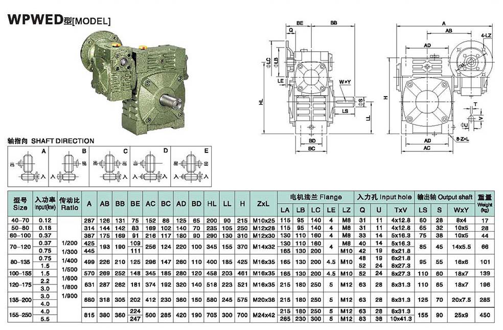 WPWED雙級萬能減速機的外形安裝尺寸.WPWED雙級蝸輪蝸桿減速機選型指南,WPWED雙級減速機法蘭輸入,軸輸出.WPWED雙級減速機軸指向表示方法.機座號40-70到155-250,速比200到900.